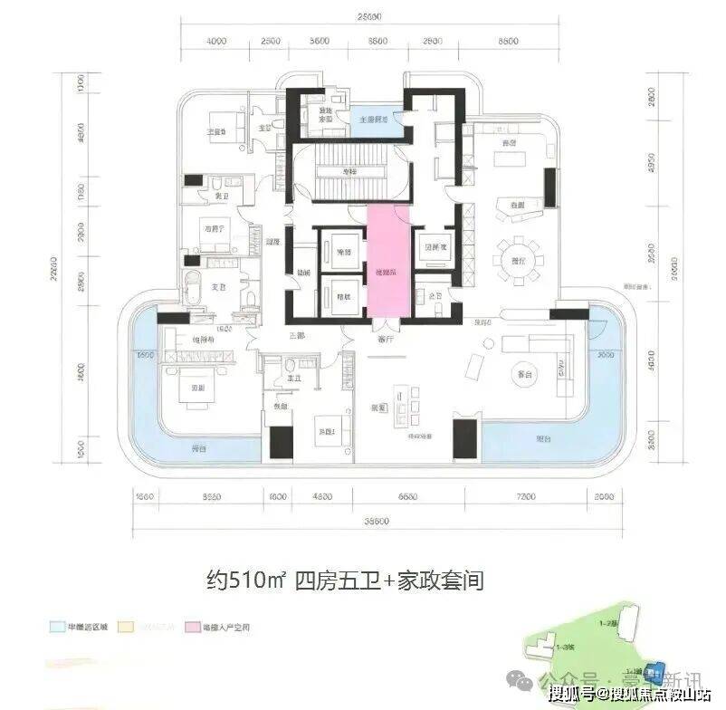 1A栋(1栋一单元)-43层:3梯1户,约510㎡,一层一户,私密性极致,为项目旗舰户型。